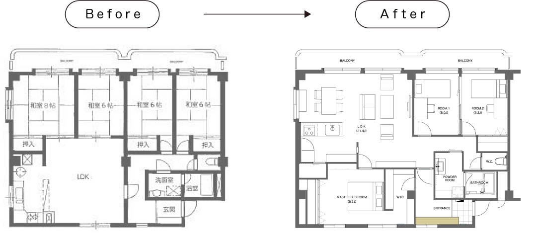 今回のリノベーションでは古いお部屋を一旦スケルトンにして、間取りを組みなおすことで、全体的にお部屋を大きく、